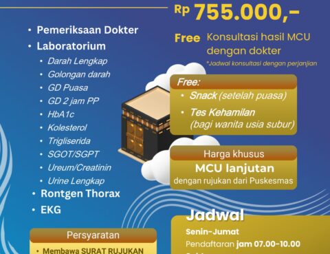Persiapkan Ibadah Hajimu dengan Tenang dan Sehat! RS Harum Sisma Medika kini menghadirkan Paket Medical Check Up Calon Jemaah Haji Reguler Hanya Rp 755.000,-Sudah termasuk:– Pemeriksaan Dokter– Pemeriksaan Laboratorium Lengkap (Darah, Urine, Kolesterol, Gula Darah, dan lainnya)– Rontgen Thorax & EKG* Free konsultasi hasil MCU dengan dokter* Free snack setelah puasa & tes kehamilan (bagi…