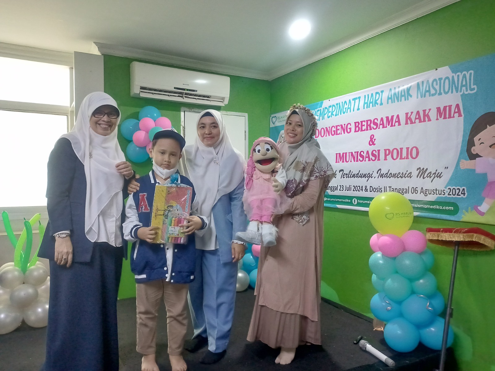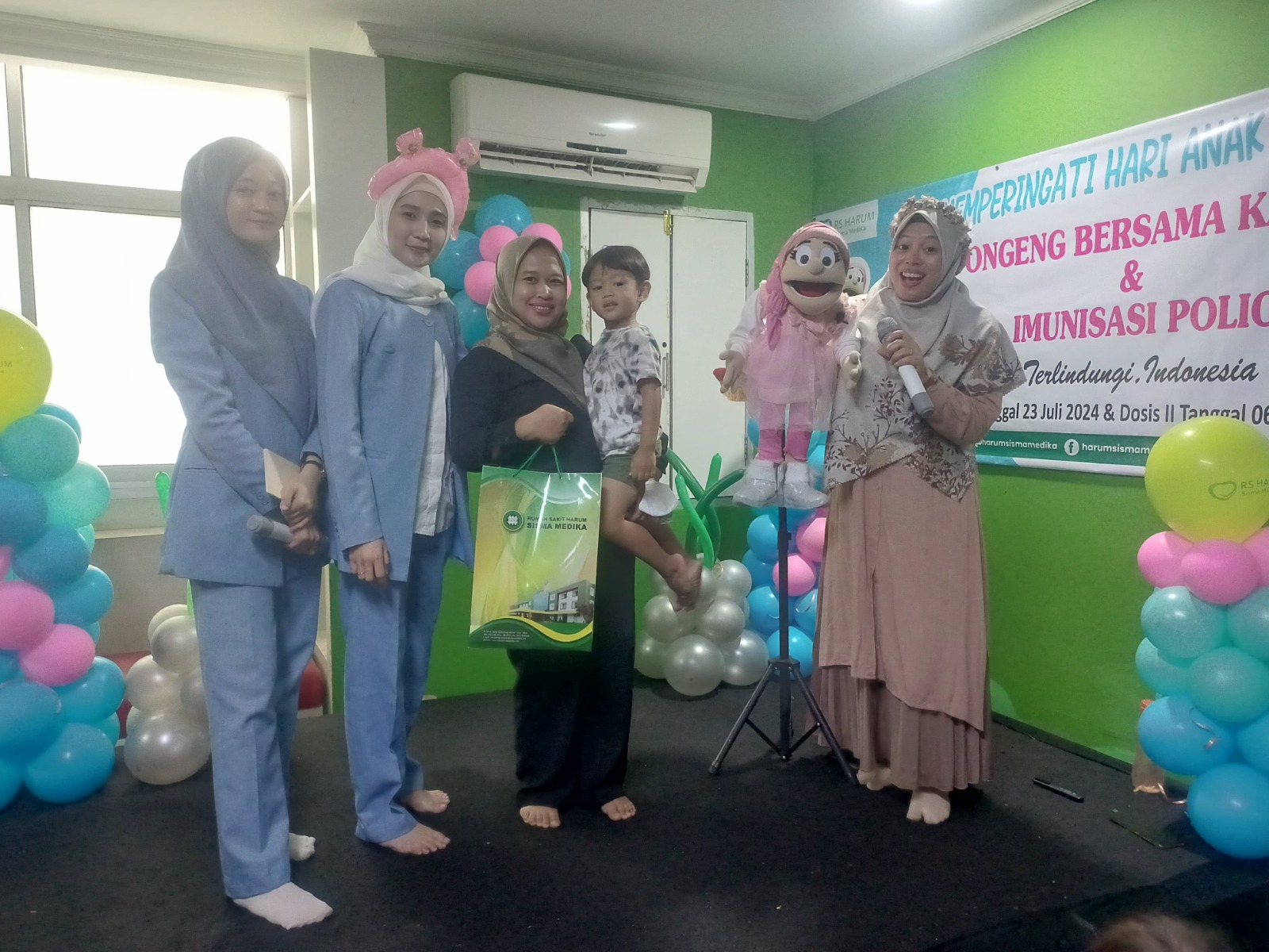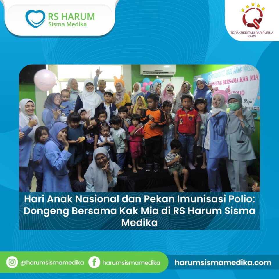 Selasa, 23 Juli 2024, RS Harum Sisma Medika dengan penuh kebahagiaan mengadakan kegiatan Hari Anak Nasional dan Pekan Imunisasi Polio serta Dongeng bersama Kak Mia. Acara ini diselenggarakan dalam rangka memperingati Hari Anak Nasional yang merupakan momen penting untuk menghargai dan merayakan keberanian, kreativitas, dan kebahagiaan anak-anak. Dalam acara ini anak anak dapat merasakan keceriaan serta kehangatan momen bersama Kak Mia. Selain itu, acara ini juga memberikan kesempatan bagi anak-anak untuk mendapatkan imunisasi polio yang sangat penting dalam menjaga kesehatan mereka.