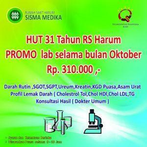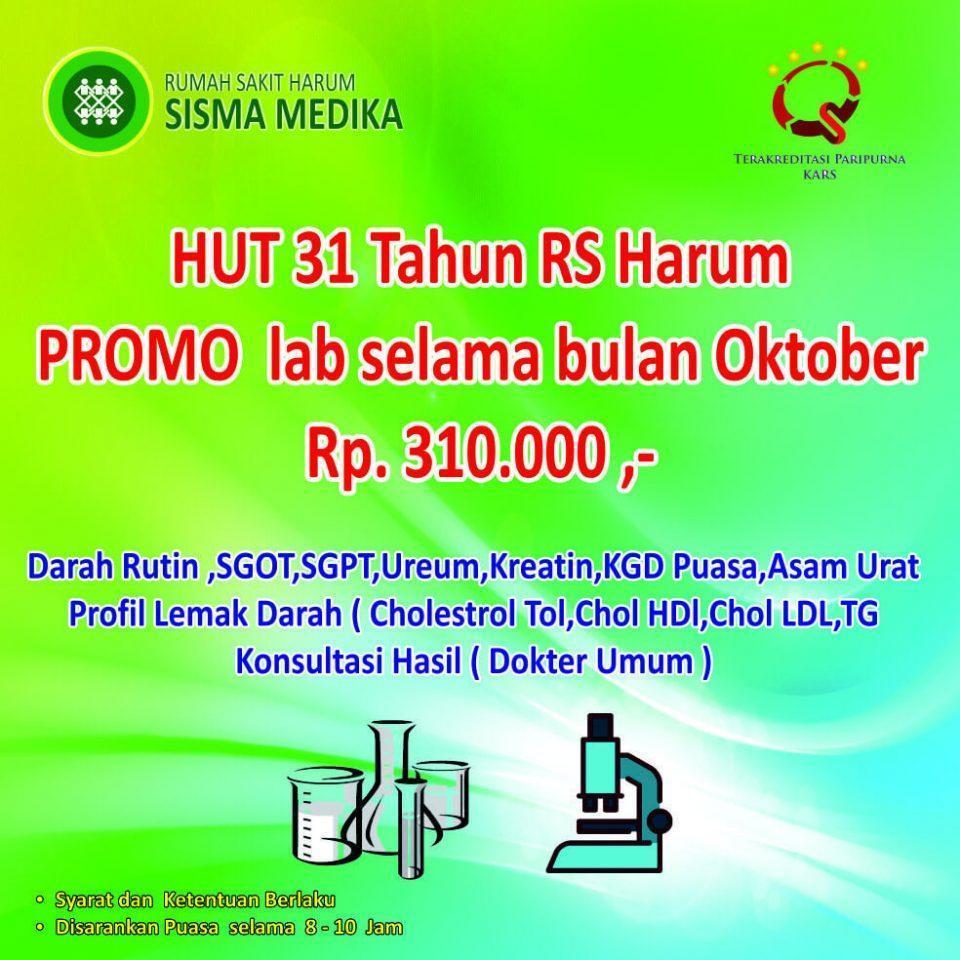 Nah, merayakan HUT ke-31 RS Harum Sisma Medika, kami ingin berbagi kebahagiaan dengan menghadirkan Promo Pemeriksaan Laboratorium selama bulan Oktober dengan hanya Rp. 310.000 saja!