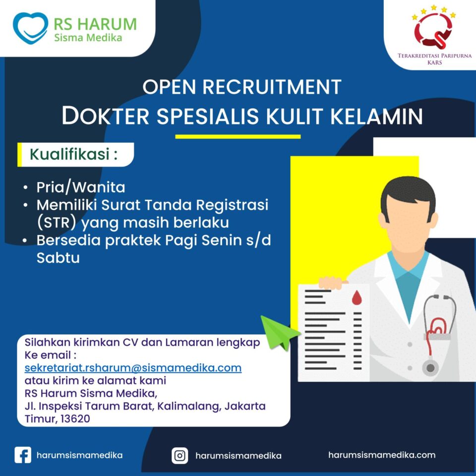 Dibutuhkan Segera !! Saat ini Rumah Sakit Harum Sisma Medika di wilayah Jakarta Timur sedang membuka lowongan pekerjaan bagian Dokter Spesialis Kulit & Kelamin dan dengan syarat ketentuan tertera di gambar berikut.