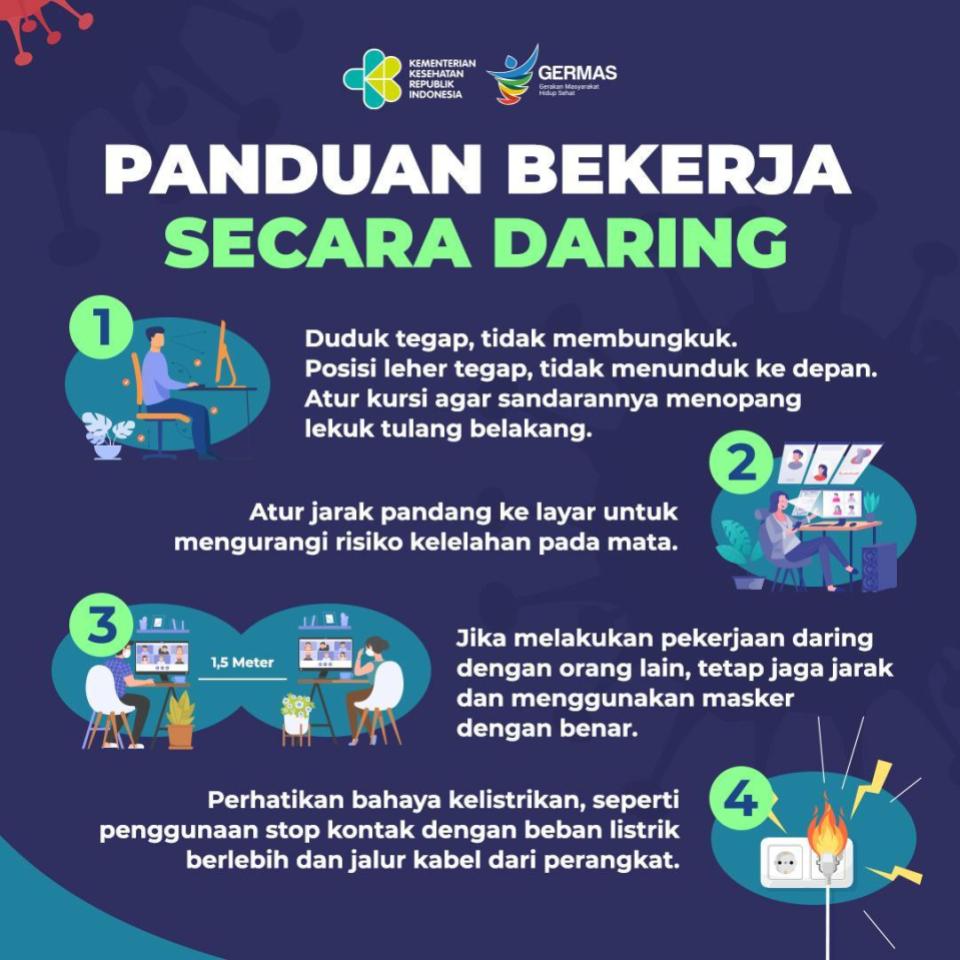 Meski #dirumahaja saat pandemi Covid-19, kita bisa tetap produktif dengan tetap bekerja secara daring. Namun, bekerja secara daring di depan komputer atau gadget terlalu lama dapat meningkatkan risiko masalah kesehatan. Mari simak panduan bekerja secara daring berikut ini, agar bekerja tetap produktif dan aman dari Covid-19.