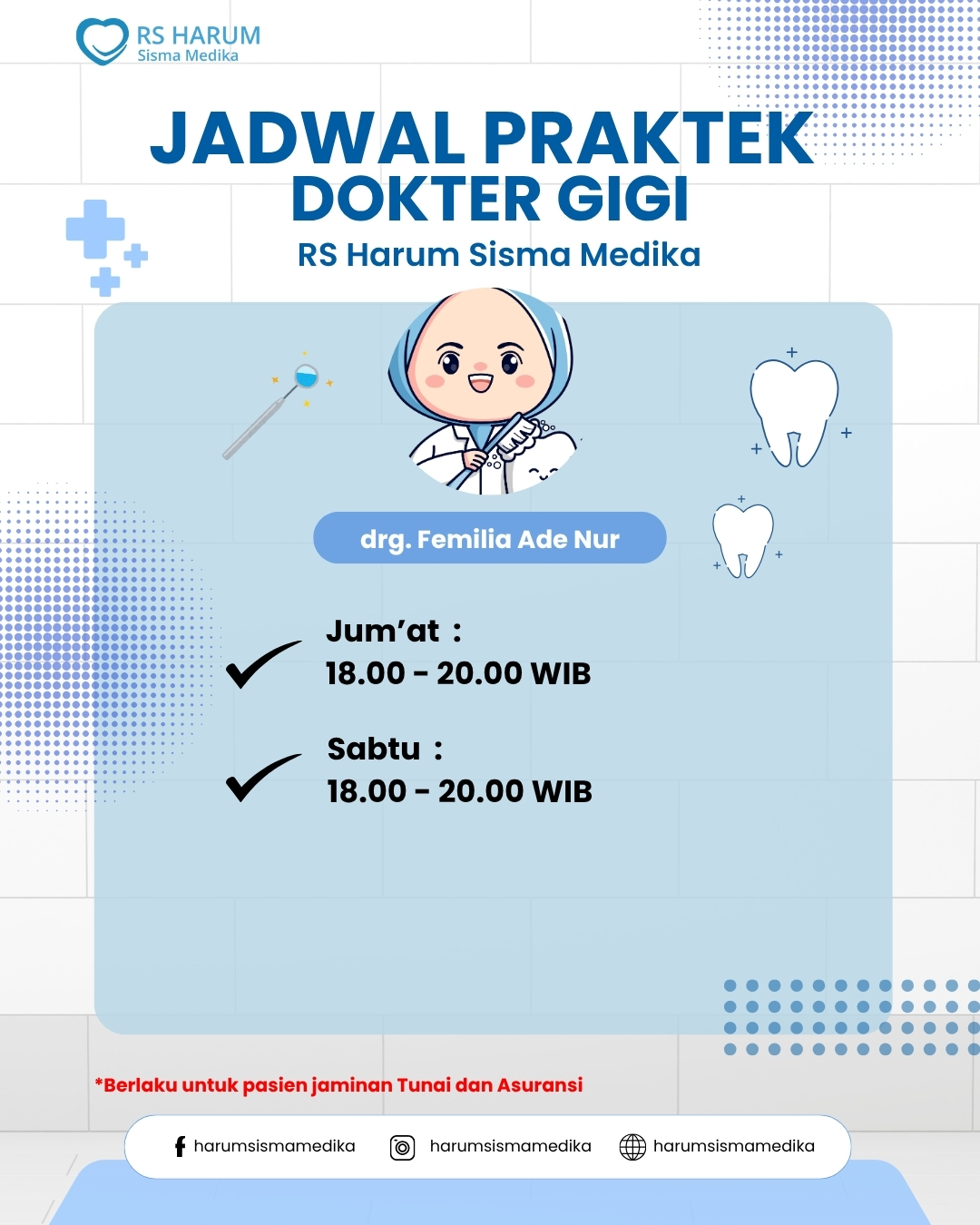 RS Harum Sisma Medika juga menyediakan layanan pemeriksaan dan perawatan gigi dengan jadwal praktik dokter yang fleksibel, siap memberikan pelayanan terbaik untuk kebutuhan Anda dan keluarga.